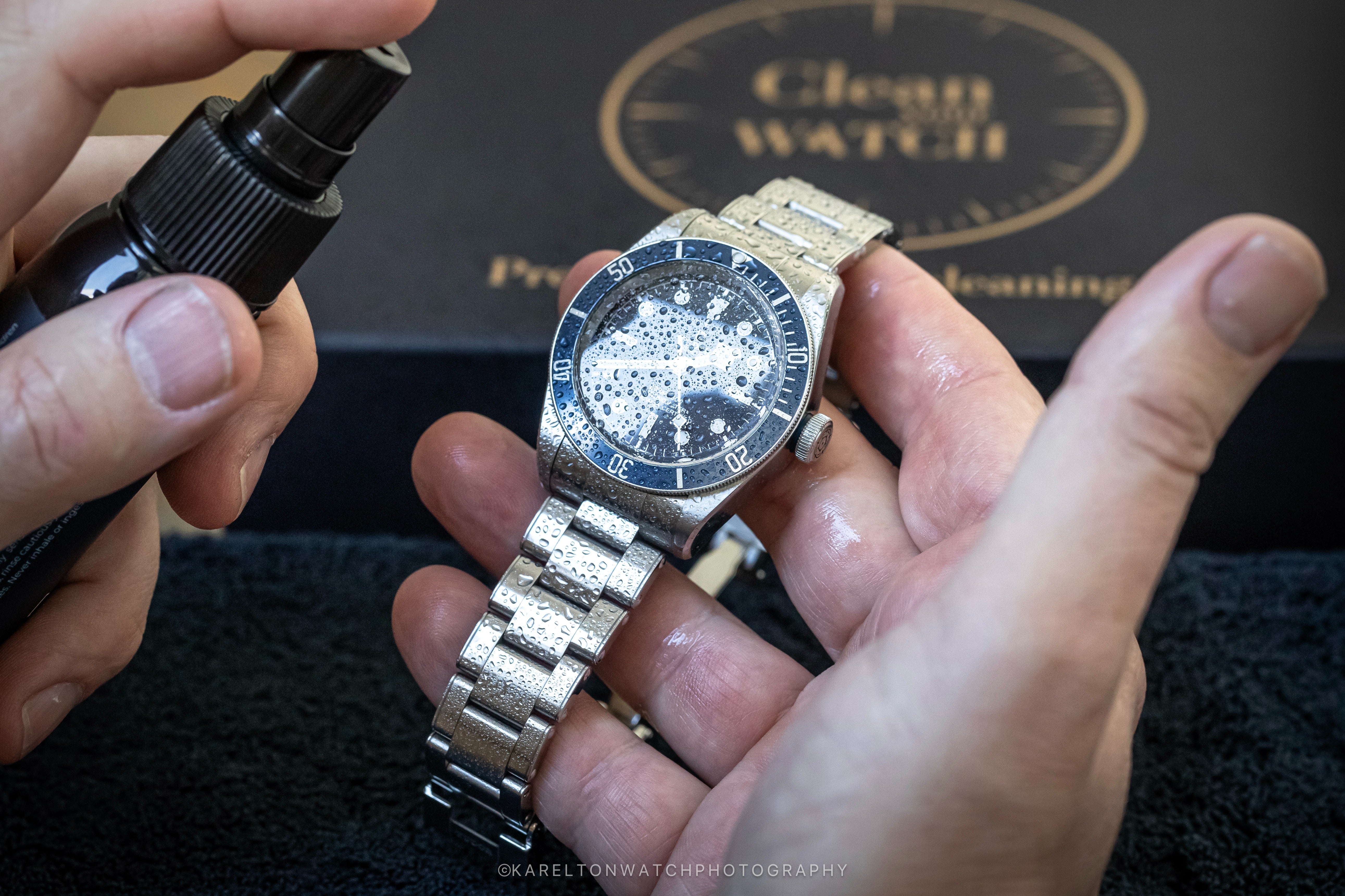 1. Sprühen Sie das Reinigungsspray direkt auf die Uhr und das Stahlarmband. Großzügig aufsprühen, damit die Flüssigkeit den Schmutz richtig lösen kann. (Wenn Ihre Uhr stark verschmutzt ist, spülen Sie sie zuerst unter fließendem Wasser ab).